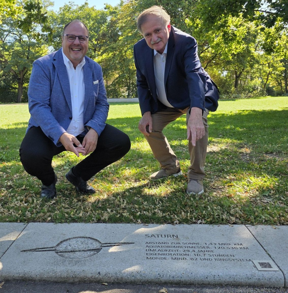 Die Idee dazu hatte der Geschäftsführer der Sternwarte, Matthias Gräter: „Die Gelegenheit der Parkneugestaltung müssen wir nutzen“ meinte er zu Dr. Dieter Hölzl (im Foto rechts), dem Präsidenten der Astronomischen Gesellschaft in der Metropolregion Nürnberg e.V. (AGN), die das Projekt an die Stadt herantrug, die fachliche Betreuung übernahm und Faltblatt und Website erstellte. Bei einem Fototermin mit Bürgermeister Christian Vogel (im Foto links) dankte Hölzl der Stadt Nürnberg/Servicebetrieb Öffentlicher Raum und dem Landschaftsarchitekten für den Bau dieses Modells des Sonnensystems: „Wir laden alle ein, die relativen Größen und Abstände der Planeten zu erleben, und möchten Neugierde für die Wunder des Universums wecken – egal, ob alleine, mit Familie oder einer Schulklasse.“
